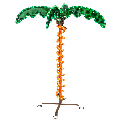 These rope light palm trees with holographic trunk and fronds provide brilliant lit decor for a wide variety of uses. The green LED rope light of the canopy and amber light of the trunk reflect off the tree's surface to boost the atmosphere of any setting. Portable and long-lasting, these make terrific decor for event planners, retail settings, covered patios, porches and decks, and more.