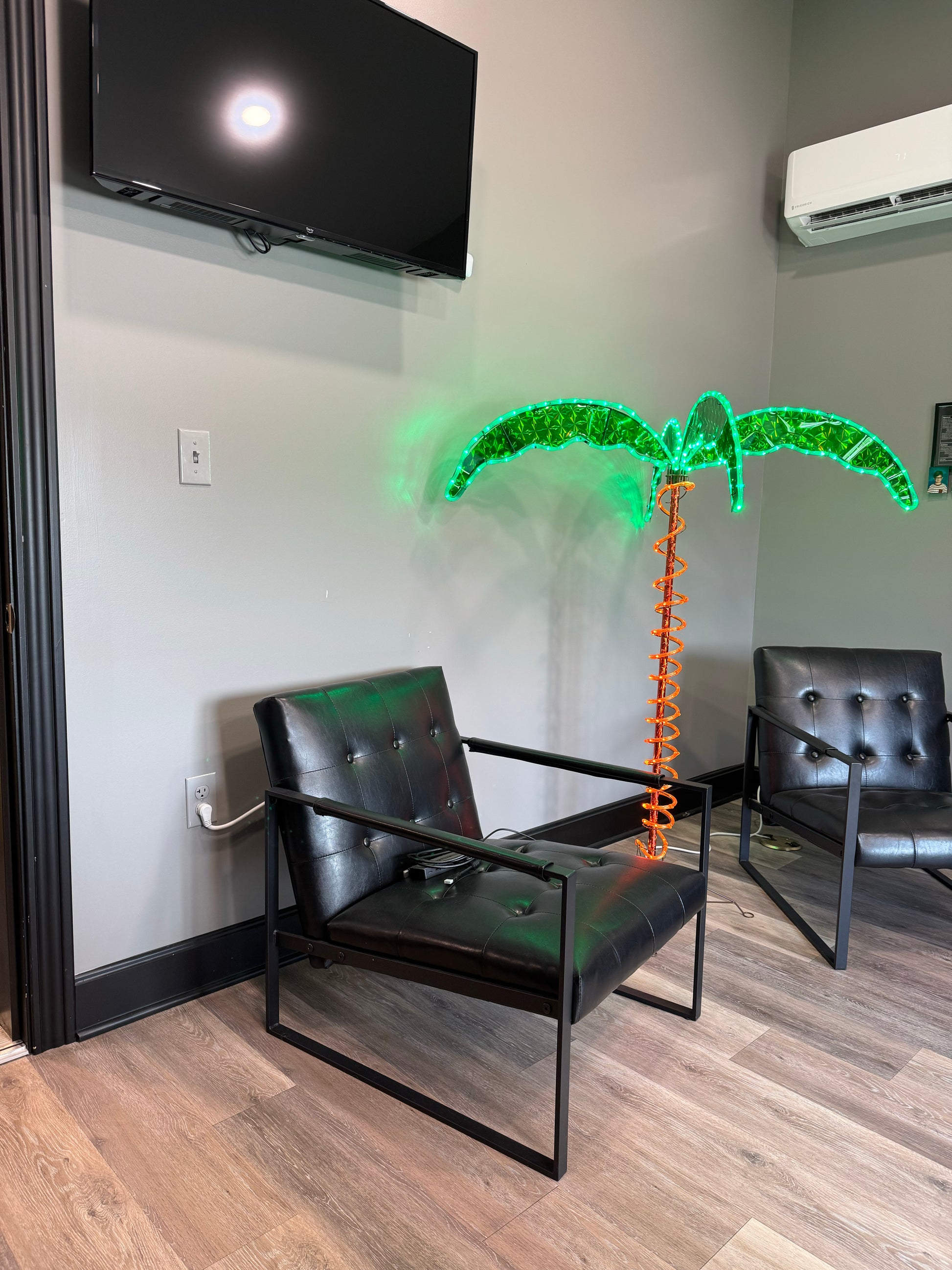 These rope light palm trees with holographic trunk and fronds provide brilliant lit decor for a wide variety of uses. The green LED rope light of the canopy and amber light of the trunk reflect off the tree's surface to boost the atmosphere of any setting. Portable and long-lasting, these make terrific decor for event planners, retail settings, covered patios, porches and decks, and more.